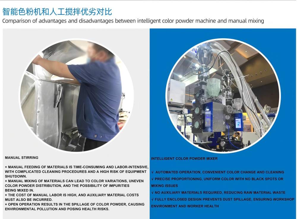 100KG/saat"Ağıllı Rəng Pudra Qarışığı" mərkəzləşdirilmiş qidalanma sistemləri, mərkəzi daşıma sistemləri və avtomatik material idarəetmə sistemləri ilə qüsursuz şəkildə birləşdirilə bilər. Plastic Color Mikser yüksək dəqiqlikli çəki ölçən sensorlarla təchiz olunub, bu da qarışdırma prosesinin vahidliyini və rəngin konsistensiyasını təmin edir və çoxkomponentli tozların və əlavələrin avtomatik nisbətini dəstəkləyir.